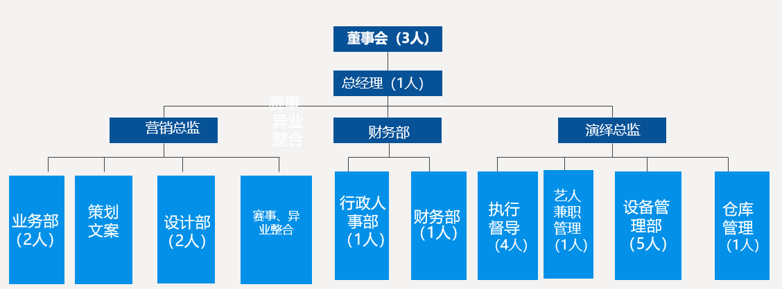 公司目前四大業務模塊:線下活動執行、抖音藍V運營、物料制作和印刷、生日派對,每個模塊獨立運營,公用財務和行政人員。
